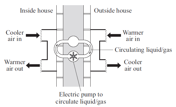 (b) To increase energy efficiency, a householder installs a heat exchanger to an outside wall of the house. The heat exchanger uses heat from the air outside to warm the inside of the house. The diagram shows the idea of the heat exchanger.